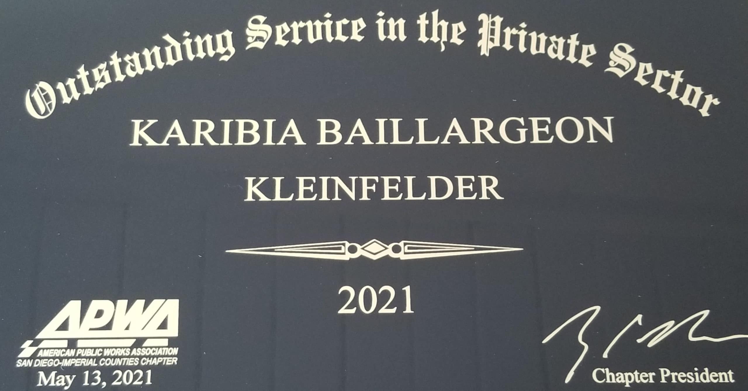 Baillargeon’s undeniable commitment to public service has established her as a leader that is dedicated to making a difference in the industry. “Karibia commits her time and energy to helping this industry succeed, whether it’s through project work or volunteering through associations. She is truly deserving of APWA’s recognition,” stated Kleinfelder Client Account Manager Vic Bianes, who has been a member of APWA for the past 15 years and serves as a Technical Director on APWA’s National Board.
