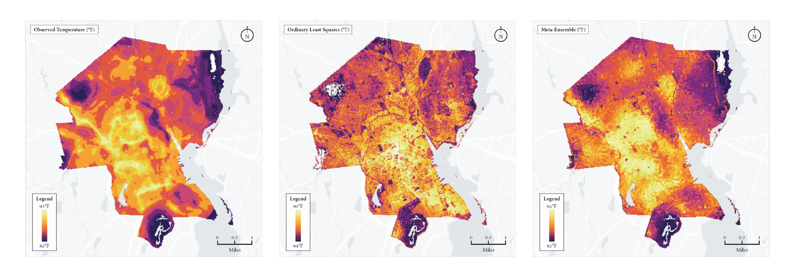 Figure: Comparison of observed ambient air temperature (left), the industry-standard Ordinary Least Squares (OLS) model (center), and the proposed spatial ensemble methodology (right). The OLS model achieved a 26% prediction accuracy and overfit local noise, while the new approach, integrating geostatistics, machine learning, and latent spatial structure, achieved an 85% prediction accuracy, closely reproducing the spatial pattern and magnitude of observed urban heat.